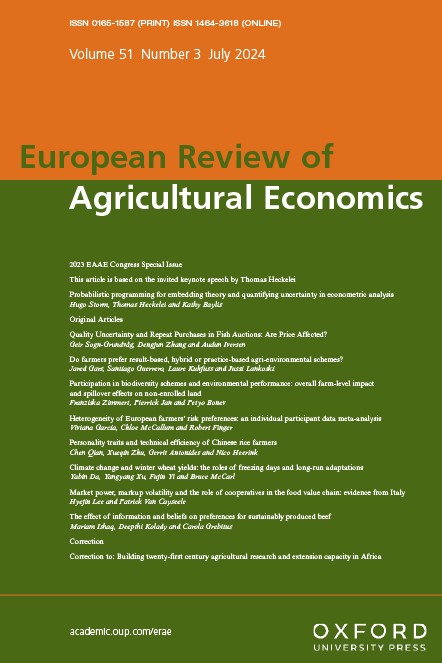Garcia, V., McCallum, C., & Finger, R. (2024). Heterogeneity of European farmers’ risk preferences: an individual participant data meta-analysis. European Review of Agricultural Economics, 51(3), jbae012. https://doi.org/10.1093/erae/jbae012